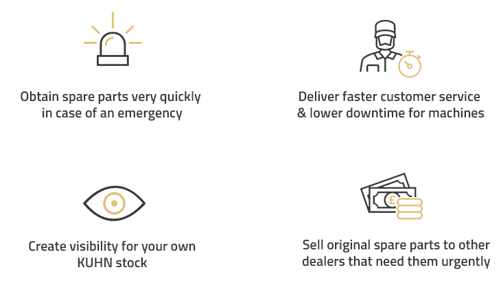 With this online tool, you can search for any part within the KUHN distribution network that’s either temporarily unavailable, sold out or no longer produced, and upon finding it, contact the dealer that has it in stock.